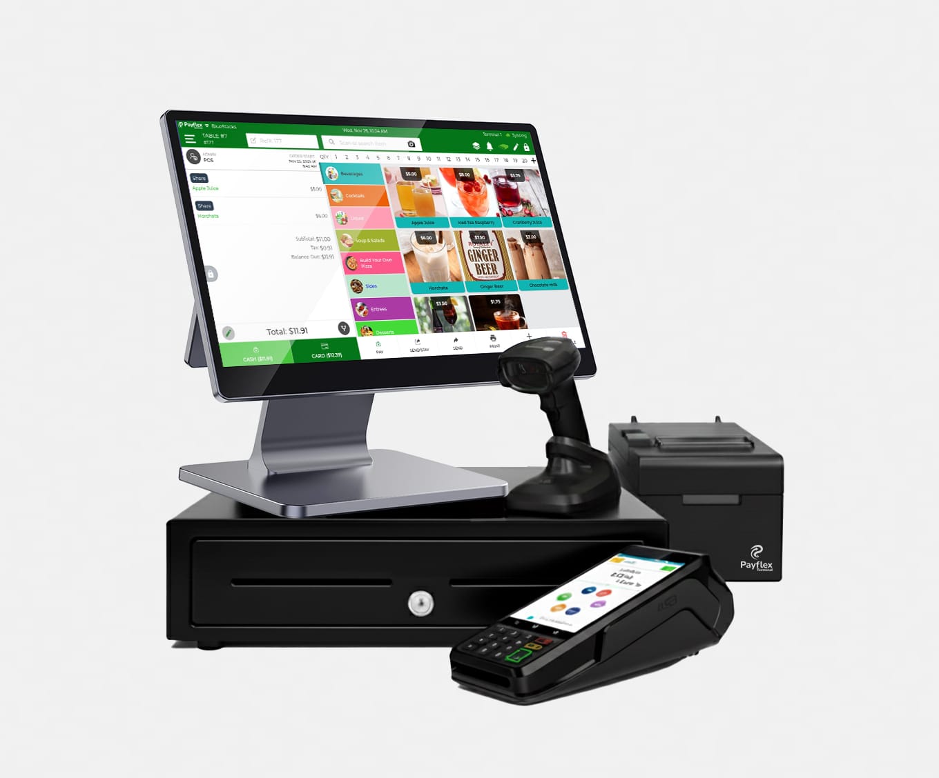 - Hardware: Includes touchscreen POS terminal, scanner, cash drawer, and wireless Payflex payment device — ready to plug & play.